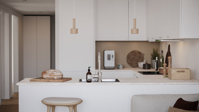 - Gode køkkener: Alle lejligheder har kvalitetskøkkener fra det danske mærke Stykka og valitetshvidevarer fra Electrolux, herunder induktionskogeplade og nedfældet vask