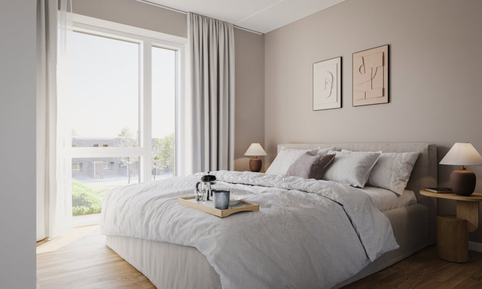 - Kvalitet: Lejlighederne er alle udført med lyse lofter og træoverflader på gulve samt vindueskarm og paneler i massiv lakeret eg.