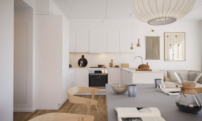 - Gode køkkener: Alle lejligheder har kvalitetskøkkener fra det danske mærke Stykka og kvalitetshvidevarer fra Electrolux, herunder induktionskogeplade og nedfældet vask