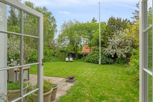 Haven omkranses af gamle træer og frodig beplantning. Terrassen byder på masser af plads og forbindelse til huset med gode adgangsforhold fra stue og køkken.