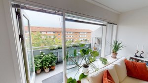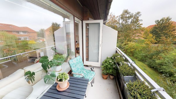 Altanen på Ahornvej 3B, 2. tv. giver en rolig uderum med højt udsyn til grønne arealer. De store glaspartier lader dagslyset strømme ind og inviterer til afslapning udendørs året rundt.