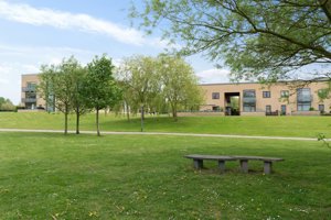 Mellem bygningerne breder sig store, velpassede græsarealer og træer. De åbne områder inviterer til ophold, leg og udeliv for både store og små.