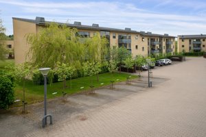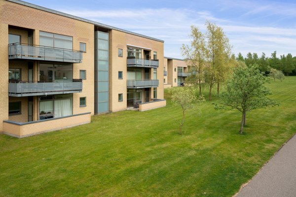 Fællesarealerne med græs, træer og stier indbyder til korte gåture, leg og udeliv lige uden for døren. Ejendommens enkle, moderne arkitektur med terrasser og altaner mod det grønne og luft mellem bygningerne bidrager til oplevelsen af et åbent og venligt kvarter.