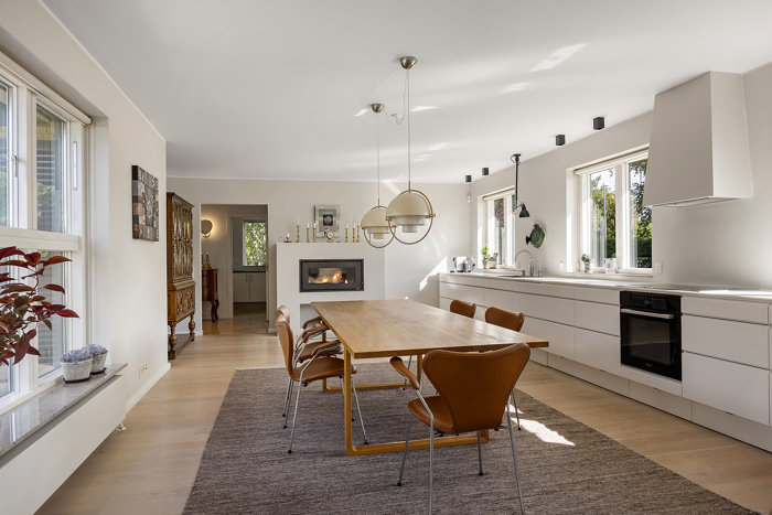 Det åbne køkkenalrum byder på optimale rammer til hverdag og gæster. Her sørger store vinduer for godt lysindfald, og der er direkte udgang til den hyggelige terrasse og have.