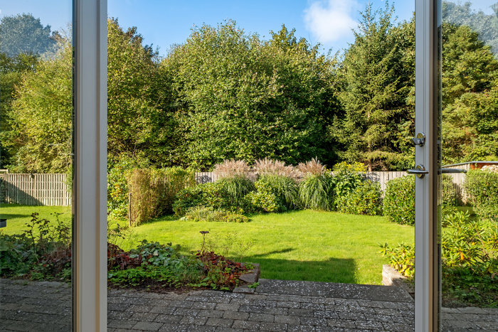 Stuen har store vinduer, der trækker sollys ind og skaber en indbydende atmosfære. Direkte udgang til terrasse og have forstærker fornemmelsen af naturlig sammenhæng mellem inde- og udeliv.