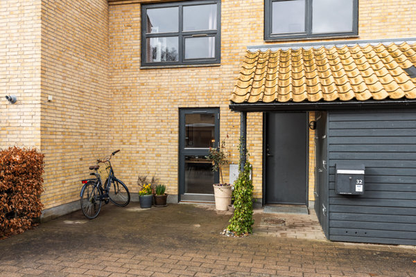Facaden fremstår indbydende med gule mursten, fine vinduespartier og hyggelige detaljer. Udendørsarealet giver en naturlig overgang fra det fri til hjemmet.