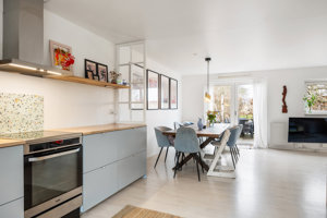 Køkkenet er lyst, rummeligt og veludnyttet med store vinduer og direkte udgang til det fri. Det åbne køkkenalrum bidrager til en harmonisk overgang mellem madlavning og ophold.