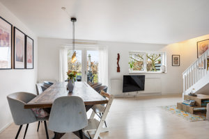 Stuen har store vinduer, et behageligt lysindfald og udgang til terrasse. Den åbne forbindelse til køkkenet skaber et naturligt flow mellem rummene og inviterer til fællesskab og afslapning.