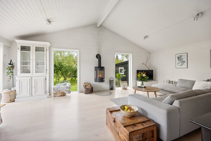 Indenfor opleves boligen som indbydende og funktionel, hvor brede vinduespartier lader lyset strømme gennem rummene.