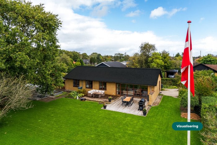 Udenfor venter jer en dejlig, ugeneret have på en 806 m² stor grund, hvor børnene kan lege frit og hvor de voksne kan nyde freden på den vestvendte terrasse. Foran huset er der flisebelagt indkørsel og en garage på 29 m² med port, og haven rummer også et skur til opbevaring af haveredskaber, legetøj og cykler.