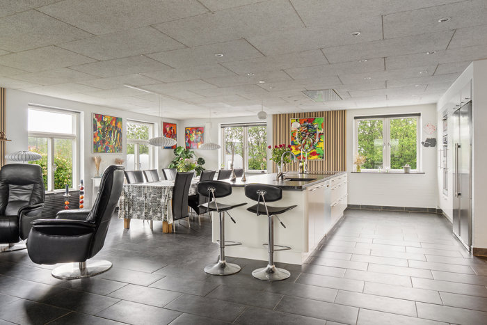 Køkkenet er klassisk og lyst med god skabsplads og mulighed for en lille spisekrog. Herfra er der adgang til boligens hjerte – den store stue, hvor lyset strømmer ind gennem de store vinduespartier. Her er der rigeligt med plads til at indrette sig både med spisebord og sofagruppe, og fra stuen kan I gå direkte ud i udestuen, hvor sæsonen kan forlænges langt ind i både forår og efterår.