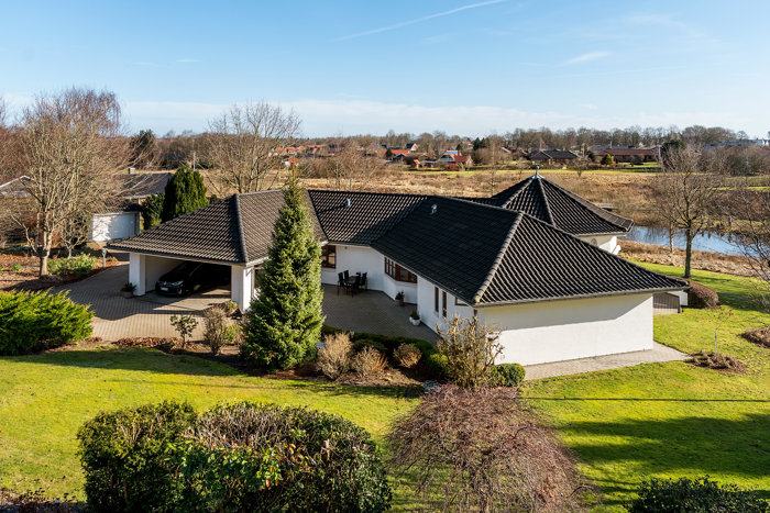 Udendørs venter en sydvestvendt have, hvor solen kan nydes dagen igennem, samt indbygget garage, som giver både praktiske opbevaringsmuligheder og nem adgang til boligen. En moderne kvalitetsvilla med god plads, gennemtænkt indretning og en attraktiv beliggenhed i et af Holstebros mest eftertragtede kvarterer.