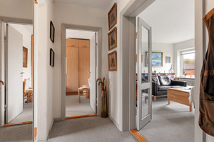 Lejligheden har en fin entré med garderobeplads. Entréen fungerer samtidig som fordelingsgang til køkkenet, stuen samt til soveværelset. Badeværelset er enkelt og funktionelt med bruser, hvidt inventar og klassisk terrazzogulv.