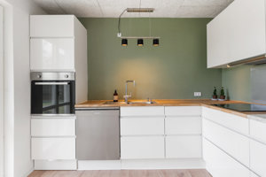 Indretningen består af tre fine værelser, et lyst badeværelse med separat bruseniche og plads til vaskemaskine samt et stort, sammenhængende køkken og stueområde. Køkkenet har en lille køkkenø og fremstår i moderne, nordisk stil med hvide fronter, træbordplade og en grøn væg – stilrent og hyggeligt. Der er dør til terrasseareal i baghaven, hvor middags- og aftensolen kan nydes.