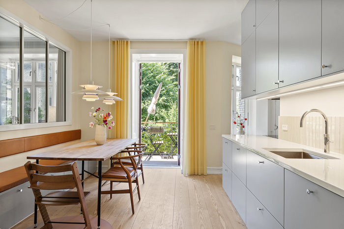 Boligens hjerte er det åbne og stilrene køkkenalrum, hvor madlavning og samvær smelter naturligt sammen. De store vinduespartier skaber en let og luftig stemning med masser af dagslys, mens den åbne planløsning giver god plads til både spisebord og sofaområde – perfekt til både hverdag og gæster.
