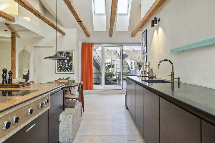 Lejligheden byder på et fantastisk opholdsrum med loft til kip, fritlagte bjælker og store vinduespartier, der lader lyset strømme ind. Det åbne køkken-alrum fremstår stilrent i hvidt design med kvalitetsmaterialer og integrerede hvidevarer. Køkkenøen skaber en naturlig samling i rummet og giver både ekstra bordplads og en hyggelig atmosfære til samvær.