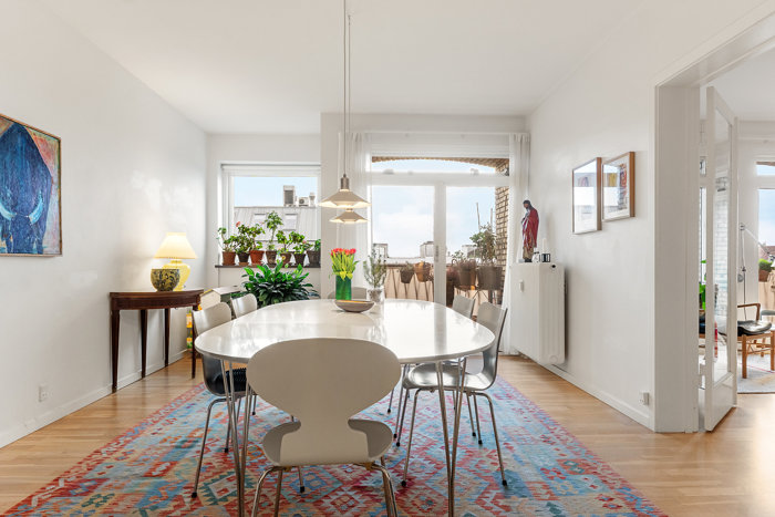 Fra det største værelse er der direkte udgang til den solrige altan, som vender mod ejendommens rolige gårdmiljø. Herfra er der kig til grønne fællesarealer og et fredeligt byrum, der giver fornemmelsen af en lille oase midt i København. De tre værelser er alle rummelige, lyse og indrettet i en afdæmpet, moderne stil – ideelle som soveværelse, børneværelse eller kontor. Overalt mærkes en rolig balance mellem bylivets puls og hjemmets privatliv.