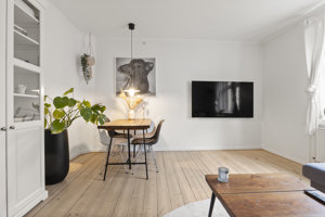 Lejligheden rummer en stor stue og et dejligt soværelse. De to rum giver en tydelig fordeling mellem ophold og værelse og skaber en overskuelig ramme for daglig indretning. Med stuen som centralt opholdsrum og værelset som separat rum fremstår boligen enkel, regulær og funktionelt disponeret