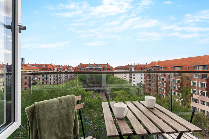 Den brede, sydvendte altan forlænger stuen og giver sol fra formiddag til aften. Her er der frit kig over det grønne gårdmiljø og de klassiske byfacader. Altanen er dyb og regulær med træplanker, galvaniserede værn og delvis overdækning, så den kan bruges det meste af året. Der er god plads til både loungemøbler og et lille spisebord, og de store skydedøre skaber en let overgang mellem inde og ude.