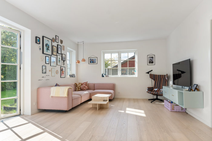 De 131 kvm fordeler sig over en ideelt udnyttet planløsning, hvor der både er plads til samvær og privatliv. I får nemlig hele fire separate værelser, og dertil kommer et godt spisekøkken og en stor, indretningsvenlig stue med direkte udgang til terrassen og haven.