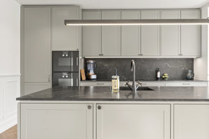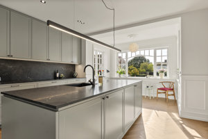 Allerede i entréen fornemmes det kompromisløse håndværk, hvor hver detalje er nøje gennemtænkt. De mørke egetræs sildebensgulve, de høje paneler og det smukke lys skaber en stemning af eksklusiv ro. Det moderne badeværelse er udført med stilrene materialer og afspejler den gennemførte kvalitet. Husets hjerte er det åbnekøkken, hvor funktionalitet møder æstetik – et samlingspunkt for både hverdag og selskab. Herfra er der adgang til den store stue med franske døre til den solrige træterrasse.