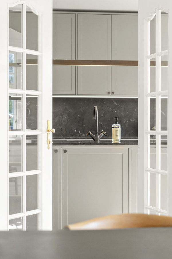 Allerede i entréen fornemmes det kompromisløse håndværk, hvor hver detalje er nøje gennemtænkt. De mørke egetræs sildebensgulve, de høje paneler og det smukke lys skaber en stemning af eksklusiv ro. Det moderne badeværelse er udført med stilrene materialer og afspejler den gennemførte kvalitet. Husets hjerte er det åbne køkken, hvor funktionalitet møder æstetik – et samlingspunkt for både hverdag og selskab. Herfra er der adgang til den store stue med franske døre til den solrige træterrasse.