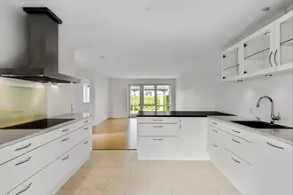 Stuen er rummelig med lyse vægge og loft samt brede vinduespartier mod udestuen, som giver et generøst lysindfald og fin kontakt til haven. Udestuen har store glaspartier og direkte udgang til terrassen, så opholdsarealerne naturligt flyder sammen.