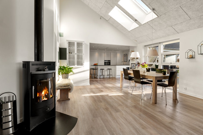 Indenfor møder I et moderniseret hjem, der balancerer fortid og nutid med stil. De synlige bjælker og charmerende detaljer spiller smukt sammen med de moderne løsninger, som især mærkes i de åbne leverum. Her samles I om hverdagen i køkkenet med ø, hvor alrum, stue og terrasse flyder naturligt sammen – og haven viser sig med sit fine kig mod ådalen.