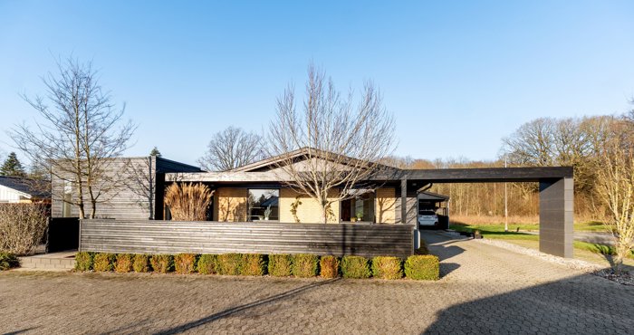 I går direkte fra huset til den store carport, hvor laderen til elbilen kan monteres, ligesom det isolerede udhus er et plus, hvad end I ønsker opbevaring eller plads til hobbyer. Den helt ugenerede gårdhave tilgås fra vinkelstuen og to værelser, hvilket skaber en helt særlig harmoni mellem inde og ude.