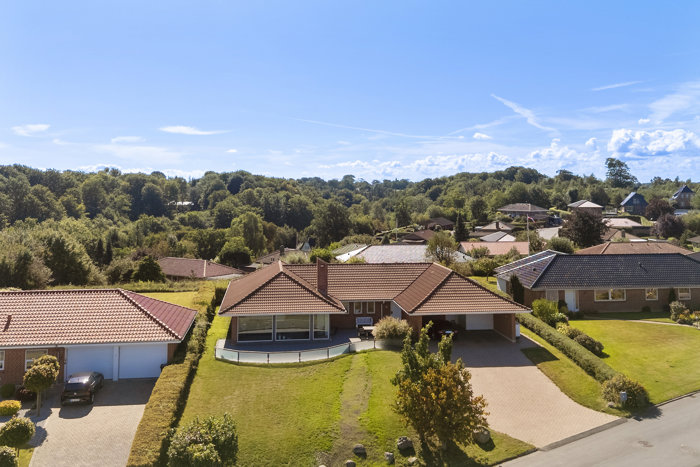 I falder pladask for villaens smukke omgivelser for enden af en lukket lomme – med en udsigt, der strækker sig fra øst til vest og sol fra syd. Grunden er kuperet med grønne græsarealer, der smelter sammen med udsigten til marker og skov.