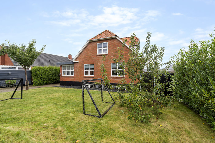 Det klassiske hus fra 1986 står med de karakteristiske røde mursten, matchende tag og hvide rammer omkring de store vinduer på en ideel placering for enden af vængets stikvej. Omkring huset breder en nem have sig, mens den delvist overdækkede terrasse slår sine folder stik mod vest, hvor der både er plads til at klatre på legestativet og dyrke drivhuset.
