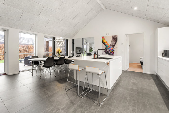 Der venter jer et lyst, stilsikkert og indflytningsklart hjem, og her udgør køkken-alrummet i stueetagen og stuen på 1. salen de to omdrejningspunkter. HTH-køkkenet er opført i et tidløst design, og fra alrummet er der direkte udgang til den sydvendte terrasse – og oppe i stuen er der gode indretningsmuligheder og udsigt til trækronerne.