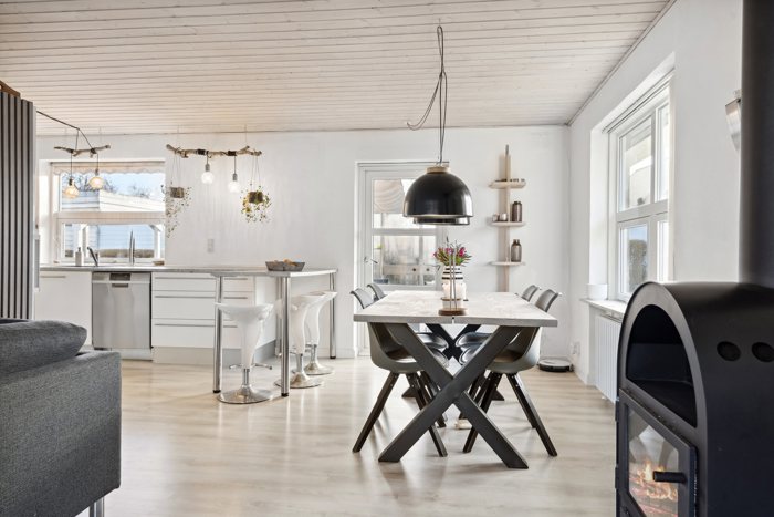 En god bid af kvadratmeterne i stueplan skal findes i det rummelige opholdsrum, der på fineste vis forbinder både stue, spisestue og køkken i ét. Her kan hverdagens forskellige gøremål foregå sideløbende ved hinanden, samtidig med at alle stunderne bades i lyset fra de sydvendte dannebrogsvinduer.