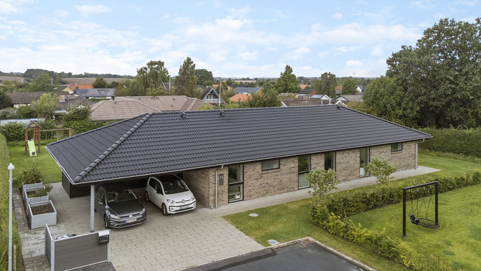 Udover den praktiske vinkelentré, som er gæsters første møde med boligen, er der også en indgang fra den integrerede carport under tagets udhæng. Når man kommer hjem fra arbejde, kan man altså gå tørskoet indenfor, selv hvis det siler ned, og i forlængelse af carporten er også et skur til opbevaring af hynder og haveredskaber.