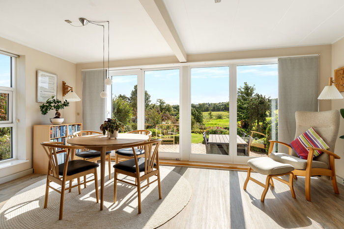 " Spisestuen med godt lysindfald og udsyn til haven."