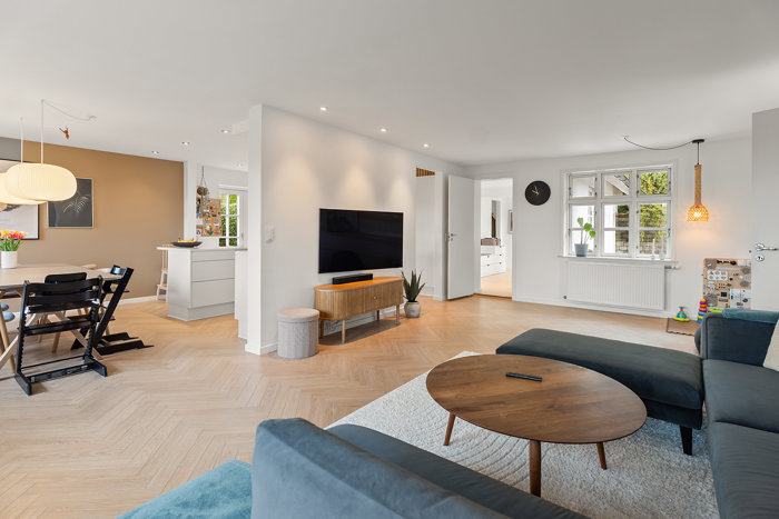 Køkken-alrum og stue smelter sammen i et lyst og venligt leverum, hvor der er god plads til både børneleg, simreretter og lange middage med vennerne. Det er nemt at forestille sig en ekstra væg, hvis I får brug for endnu et værelse, så er mulighederne i hvert fald åbne. Bryggerset ligger ved køkkenet, og gør det hele ekstra funktionelt i en travl hverdag.