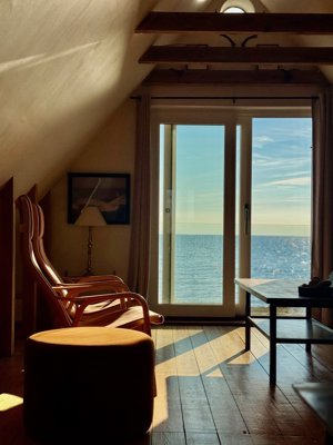Ejendommen blev gennemgribende renoveret i 2020 med blandt andet nyt tag, hulmursisolering og nye, store vinduespartier. Resultatet er et lyst og indbydende hjem med loft til kip, synlige bjælker, trægulve og en skøn fornemmelse af at naturen er en del af boligen. Spisestuen med brændeovn ligger i åben forbindelse med det stilrene køkken, hvor madlavningen får ekstra krydderi fra den betagende havudsigt.