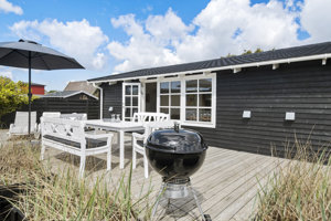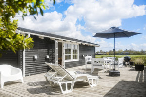 Den rummelige træterrasse inviterer til sol, afslapning og fælles måltider. Her kan man nyde udsigten til det åbne grønne område og have direkte udgang fra huset.