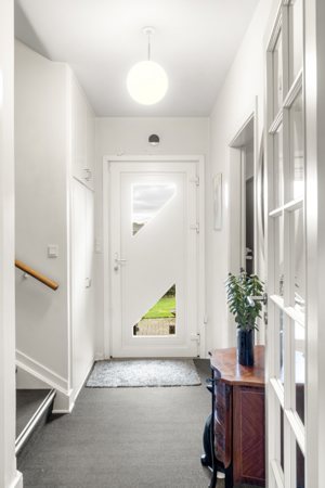 Den klassiske villa i rødsten er oprindeligt fra 1954, men er siden kærligt vedligeholdt og har i dag alt hver en familie kan drømme om. Husets 105 m² er utrolig godt udnyttet og består af entre, der fører jer videre til en stor stue med plads til både sofagruppe, hyggehjørne og spisebordsplads. Herfra er der adgang til køkkenet fra 2007, med god opbevaringsplads. Går I et par trin ned, så mødes i af et depotrum, bryggers og et værelse. Husets første sal består af to værelser og et badeværelse med bruseniche. Herfra er der et par trin op til husets anden sal, som byder på en stor stue/kontor/værelse og en hems.