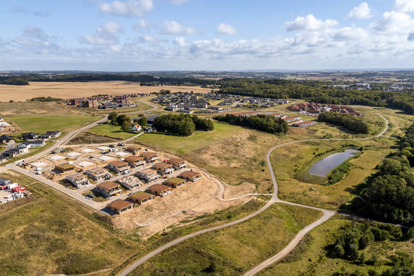 UDSIGTEN Odder består af 25 eksklusive boliger, der tilpasser sig stedets helt særlige, skrånende landskab med størst mulig nænsomhed og respekt og samtidigt står frem med en markant arkitektonisk profil. De træbeklædte huse etableres elegant ind i det skråningen således der efterlades et minimalt aftryk i det naturlige terræn. Med et fald på hele 21 højdemeter, opnår hver eneste bolig en uforstyrret sydvendt panoramaudsigt mod de grønne arealer og den beskyttede istidsdal.