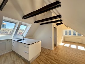 *OBS: Billederne er fra en sammenlignelig, men ikke identisk lejlighed i ejendommen. Indretning og udtryk vil derfor kunne variere – blandt andet er der ikke synlige bjælker i denne bolig.