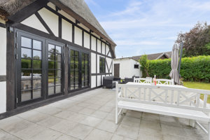 Huset fremstår med klassisk sort-hvidt bindingsværk og et flot stråtag, der giver ejendommen sit helt særlige udtryk. Den store, grønne have omkranser huset og danner en hyggelig og privat ramme omkring udelivet. På terrassen foran huset er der god plads til loungemøbler og spisebord – et naturligt samlingspunkt, når solen står højt.