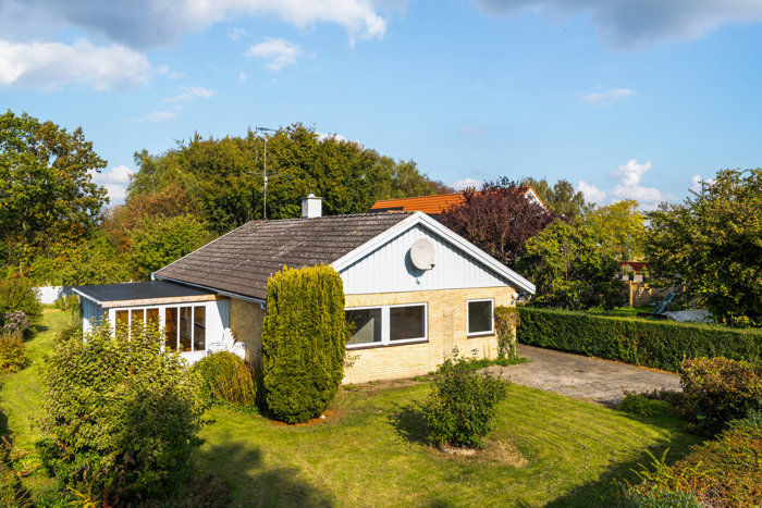 Villaens klassiske arkitektur og det røde tegltag giver et indbydende førstehåndsindtryk. Med flere vinkler og vinduespartier har huset en unik charme og attraktiv stil.