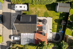 Det rummelige køkkenalrum og stuen imponerer med store vinduer og terrassedøre, der skaber et lyst, åbent miljø med optimalt lysindfald og adgang til haven.