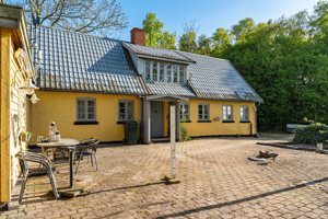 Ejendommen fremstår herskabeligt med gule facader, bølgende tag og naturskøn omkransning. Lys strømmer ind fra alle sider og understreger boligens autentiske stemning. Her bydes på fred og privatliv.