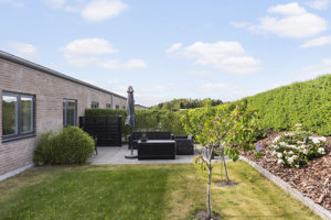 Udenfor finder man en nem og overskuelig have med terrasse på begge sider af huset, hvilket giver mulighed for sol dagen igennem. Carporten sikrer nem parkering, og i forlængelse heraf ligger et praktisk skur til opbevaring.