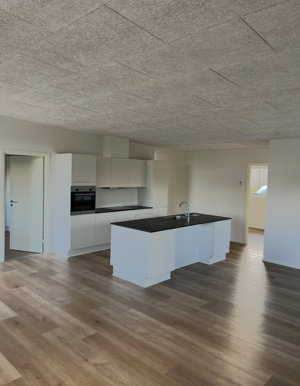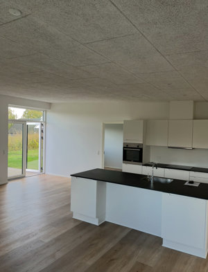 Indretningen består af et rummeligt bryggers, badeværelse med bruseniche, 2 børneværelser samt soveværelse med indbyggede skabe. Hjertet af boligen er det lyse køkken-alrum med inventar fra Invita og hvidevarer fra Siemens, som ligger i åben forbindelse med stuen, der har direkte udgang til terrassen. De store vinduespartier og den gode loftshøjde giver en dejlig rummelig og lys atmosfære.
