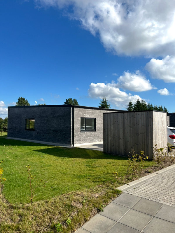 Boligen er opført i flotte mursten med ensidet taghældning og energirigtige løsninger, som sikrer lave varmeudgifter. Til huset hører 2 private parkeringspladser, et praktisk udhus på 5 m² samt en skøn have med terrasse både foran og bagved huset – perfekt til sol hele dagen.