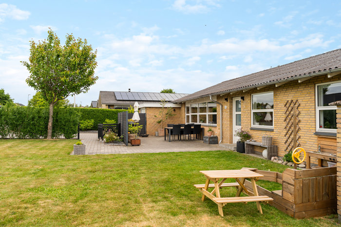 Den lukkede have ligger ugeneret med grøn plæne og gode solforhold. Langs huset findes et stort, flisebelagt terrassemiljø med overdækket parti, der forlænger sæsonen. De omkransende hegn og beplantning skaber en rolig ramme om udelivet på Hasselvej 30.