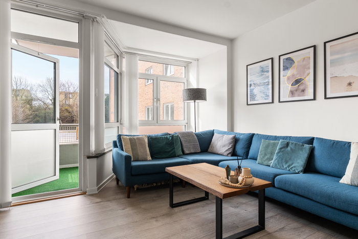 Her bydes du indenfor i et moderne, lyst opholdsrum med store vinduespartier, der sikrer et smukt lysindfald. Den åbne planløsning giver en naturlig forbindelse mellem stue og køkken, hvor der er udgang til altan.